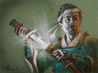 "I spent most of the profits on those accursed masks to acquire this blade: it was forged by a legendary Kaiu swordsmith to fight against the Shadowlands. Such was the skill of Kaiu Haru that he could create a blade with powdered jade worked between the folds of steel. The spirits themselves awakened in the artistry of his work and the blade glows with magical light in the presence of the shadowlands taint."