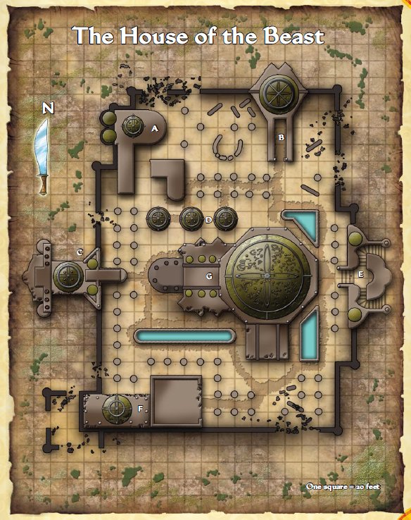 Wedged into a wide precipice along the far slopes of Pale Mountain sits the crumbling ruins of a once massive temple. Passing centuries have weathered its stones, and while some of the outer walls remain standing, they have collapsed in several places, leaving the temple grounds open to any who would approach. The House of the Beast's fearsome reputation as being a place haunted by the ghosts of genies has been its traditional defense against explorers — that, and its remote location and the angry tribes of Rovagug-worshiping humanoids who still dwell within.