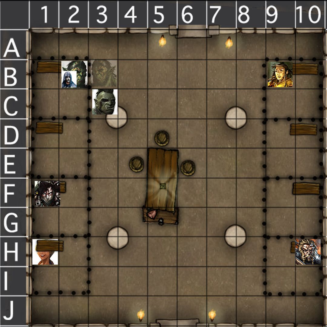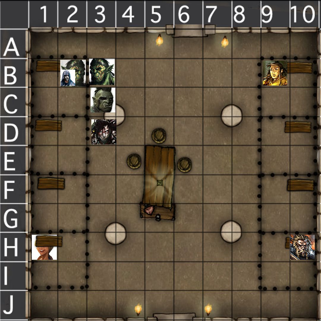 You hear muffled voices outside the door, then the creak of the bar. The door opens "Prisoners givin you troub-" A duergar stands there stunned for a moment before drawing his short sword. He scans the room, then starts to backpedal out of the room. (ends turn one square south of (J,6)