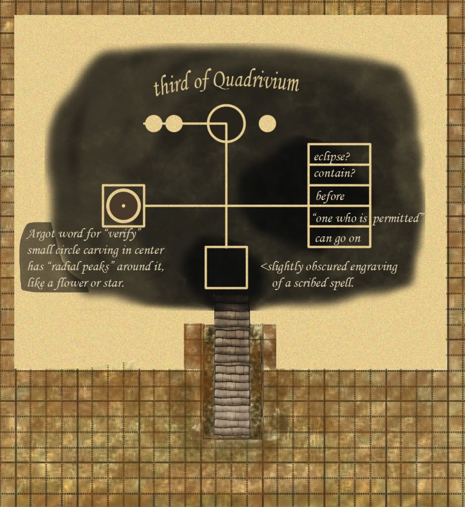 You search the tomb you find nothing new .. no hidden dangers. Then you notice a curious thing. Along the perimeter of the black pools of the creatures' innards, lines of liquid seem to disappear under the floor or rather like the lines never got wet .. As you bring the light closer it looks like an illusion of the floor covers the actual floor -- hiding engraved writing -- which is now somewhat visible as the liquid fills the carved out letters, seeping underneath the illusion.