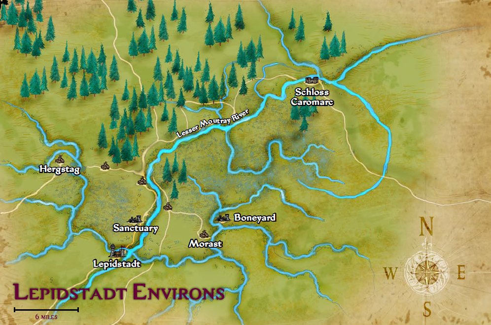 "You confirm my thoughts," said the Judge. "As you know, the trial pivots on three crimes attributed to the Beast over the course of the past year or so. The first is the killing of ten people in the village of Morast, which is about eight miles away from Lepidstadt. The village headman, Lazne, is due to give evidence tomorrow. I understand the prosecution is putting him up at The Broad Face, an inn down the road from the Courthouse that is popular with both lawyers and actors. Whether anyone else from the village has any light to shed on the matter I do not know, only Lazne appears on the docket for tomorrow."