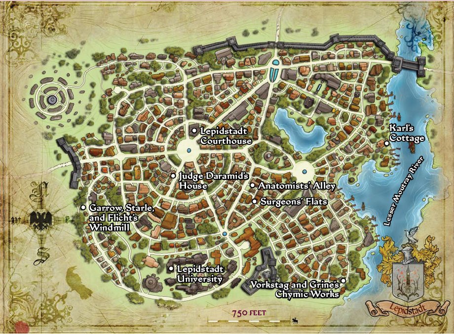 Tre'duinne and Dillan need to make their way across town to where Karl lives. (It's shown on the map of Lepidstadt.
