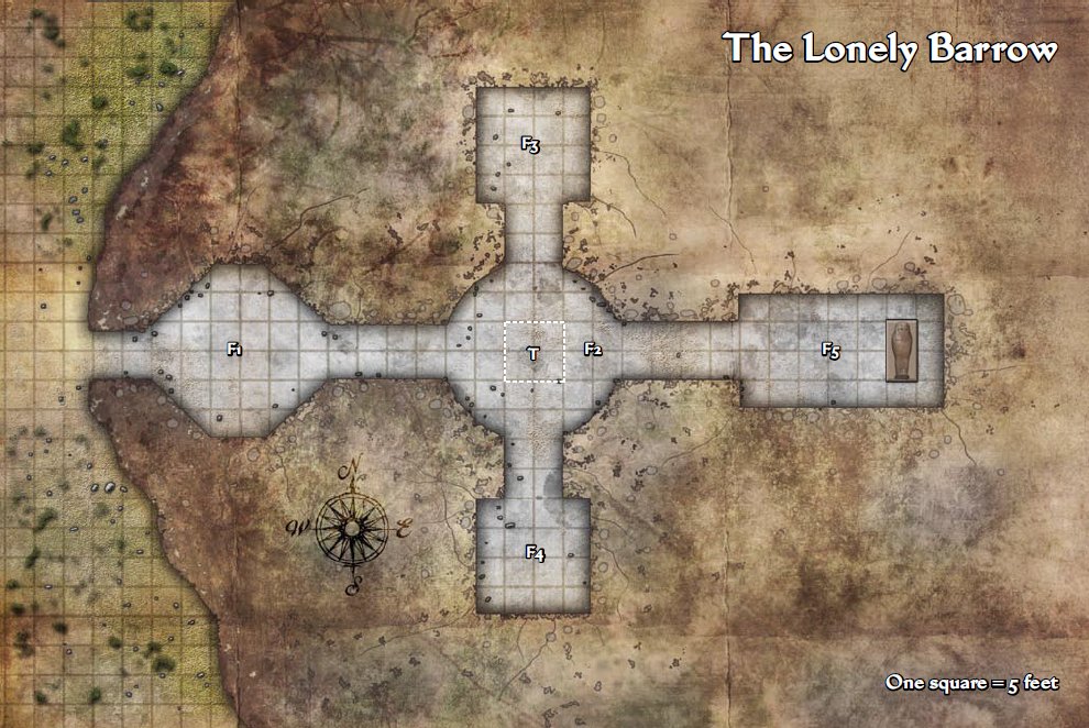 Noriel, it's explained to you that the trap Lothar was talking about is where the T is at the centre of the barrow. From out here, however, you cannot make anything out, let alone disable it.