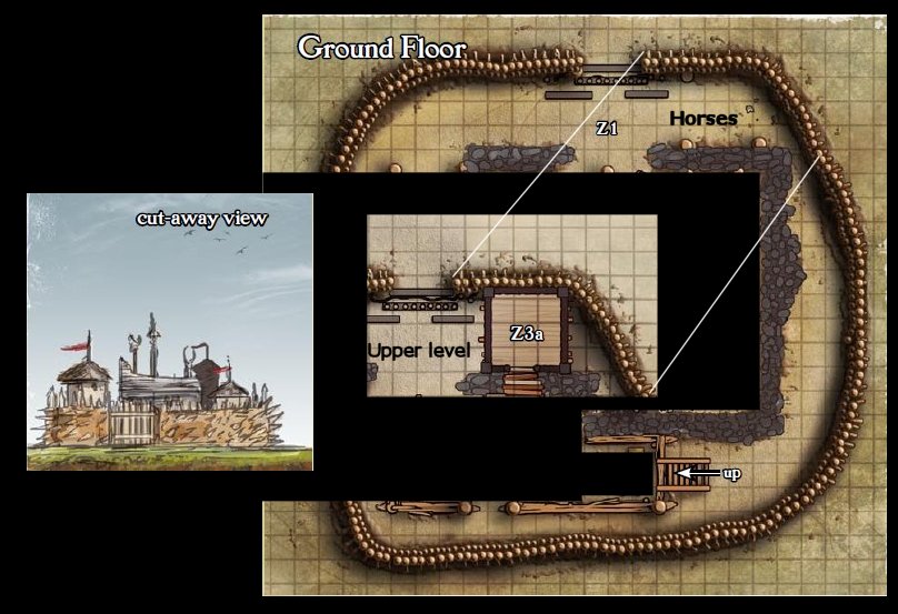 Lothar can tell you that he peered in through the opening (just below the Z1 on the map) seeing a drafty room crammed with crates, barrels, and boxes. Hammocks strung on wooden posts suggested sleeping areas, while dirty bowls and utensils rest atop rickety and makeshift furniture. Elsewhere, chamber pots sit tucked into corners, while a large iron gate was wedged into a ten-foot-wide gap in the western wall - perhaps that's where the owlbear is? The floor consists only of hard-packed earth. If there was anyone in there, they'd been asleep in the hammocks, but most folks he reckons had gone up onto the walkways, summoned by comments about the antics of the zombies on the hillside.