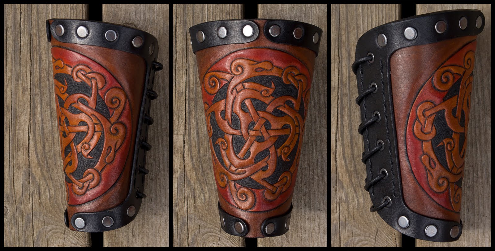 He presents Kjell with a pair of bracers, the leather masterfully worked with an intricate design. They fit Kjell as if they had been made for his strong forearms, the leather cords drawn snugly shut to close them.