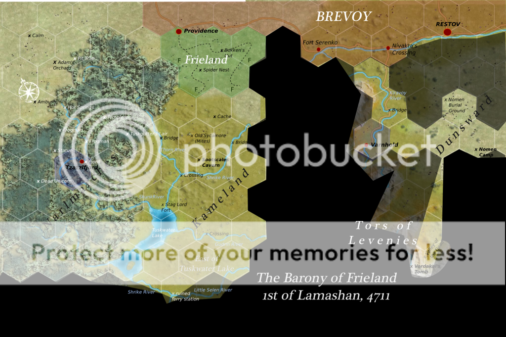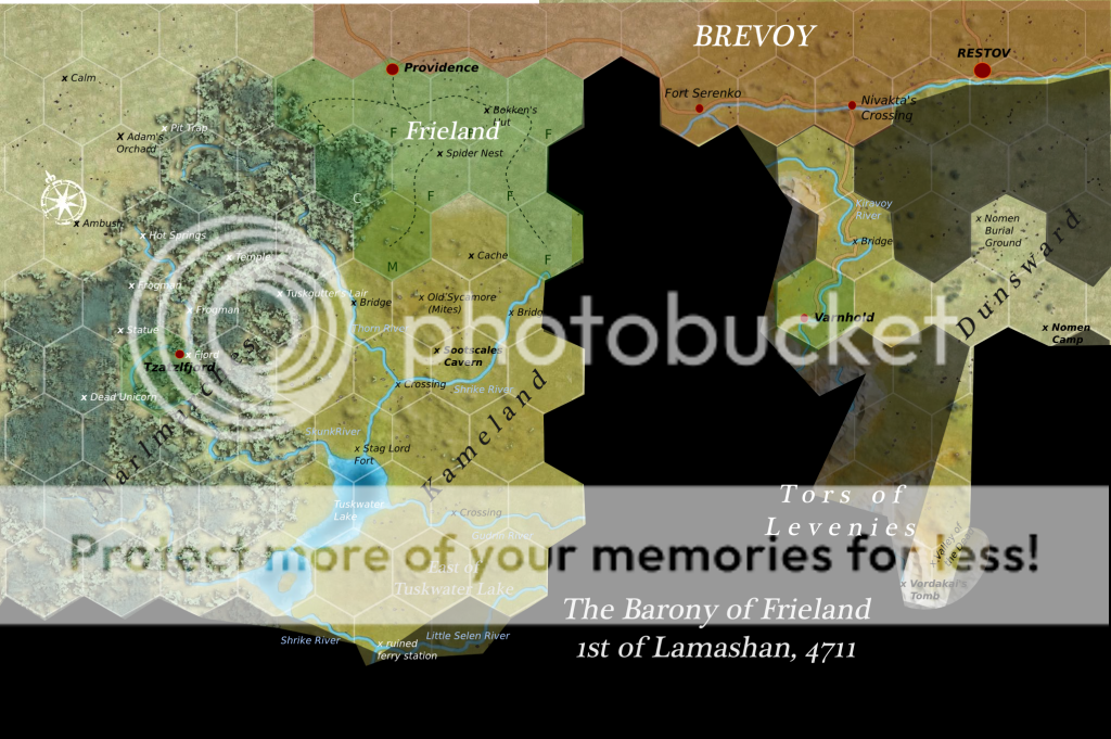 The light green hexes are what we have claimed, ten or eleven in total. Brown is the neighboring nation of Brevoy and the other colors indicate explored and colored based on their terrain. Black is unexplored, of course, and shaded is places we've been close enough to that we are aware of the terrain, but not actually explored.