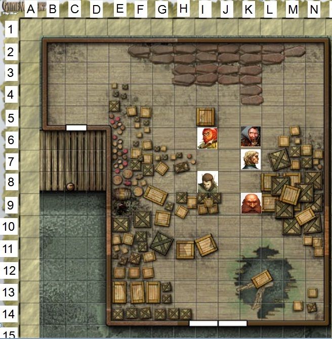 Raoul follows the rest of the party in a search of the warehouse, when the rats appear. All right, not as simple as I thought. He steps through the debris and boxes so that he is adjacent to the closest one. Please place Raoul in H9. And slashes at the rat with his rapier and quips, "Pozuket, here's your patrol. Although I'd wager these fellas aren't as dirty as the city guard."