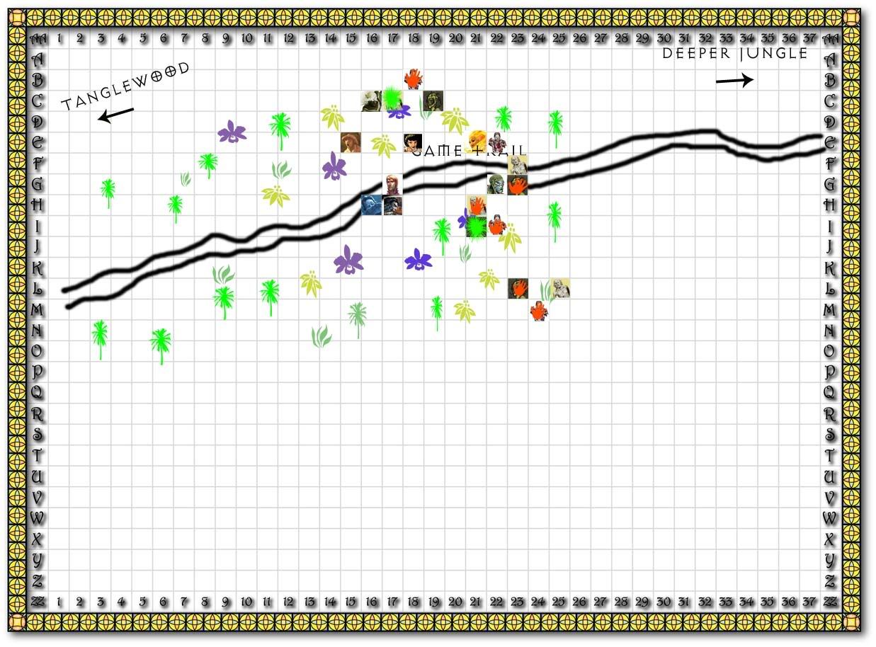 The zombie Izkrael had cut flops bonelessly to the jungle floor. The zombie that Tobias has hit with his magic missiles does as well. Of the remaining ten zombies, six turn about and begin to flee the area, their moaning rising in pitch.