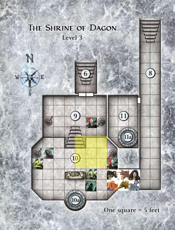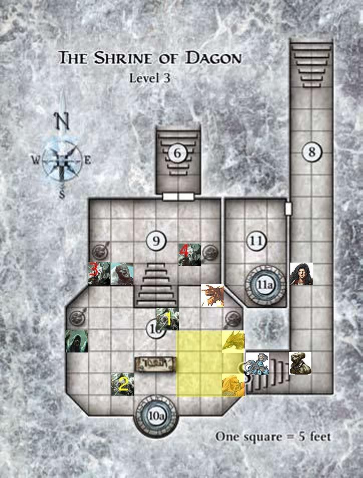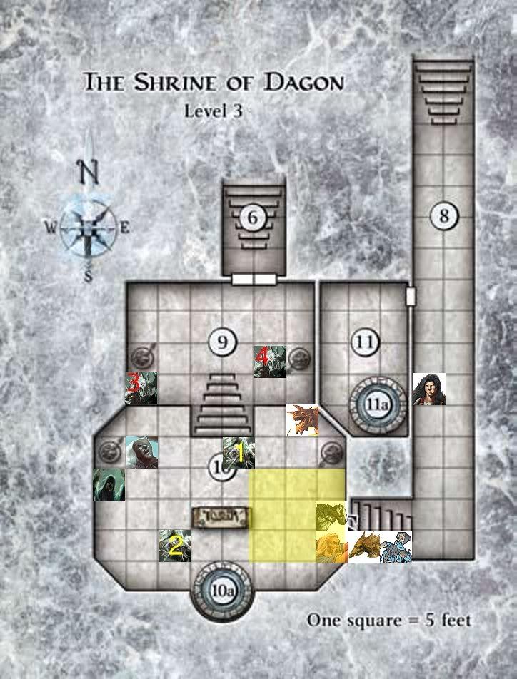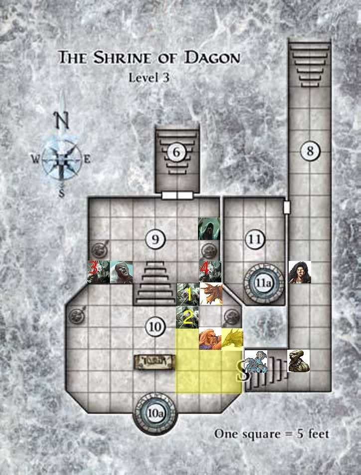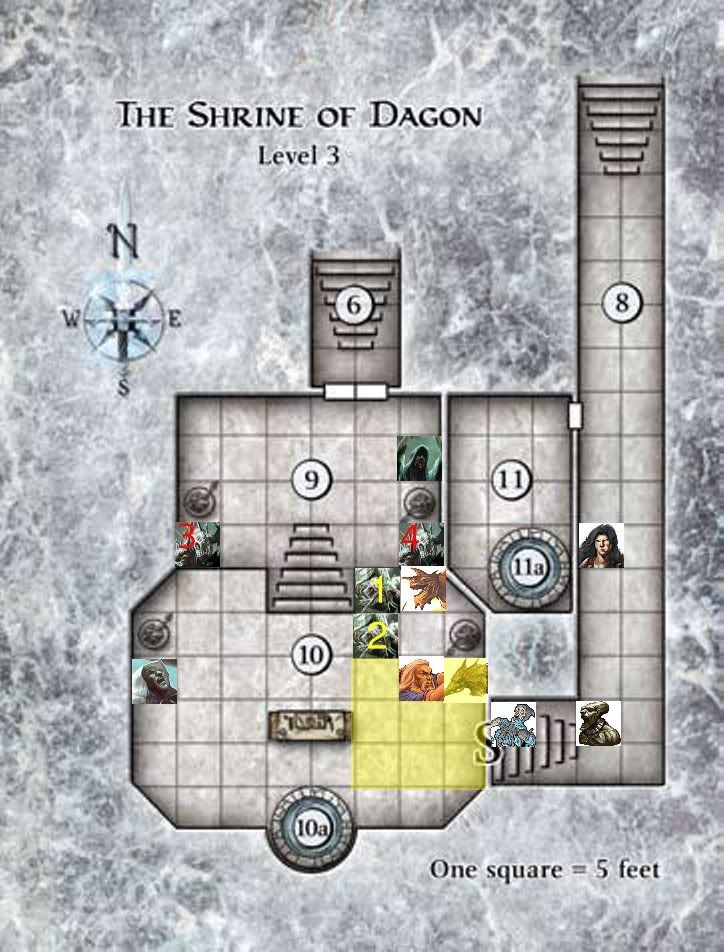Uses a move action to move the consecrated ground steps back diagonally one square and then descends one square so the bottom right corner rests on Manny with It on the square directly above but also covers fishman 1 & 3 with that cultists beneath fishman 1, the minor action to sustain it and then I guess use up the standard action for that athletics check.