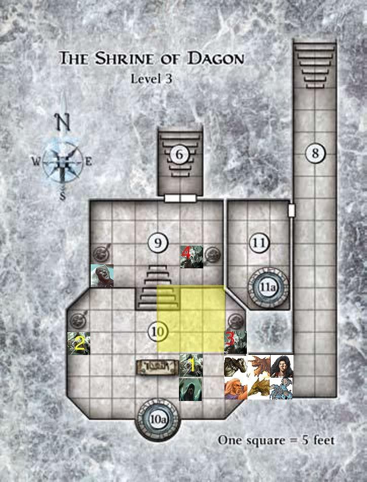 OK, how far do I have to move to get a clear shot past the altar? Will 1 step N next to Akahale do it? If not I move to the square in front of Akahale. (Dangerously close to the fish man I know.) This is my move action.