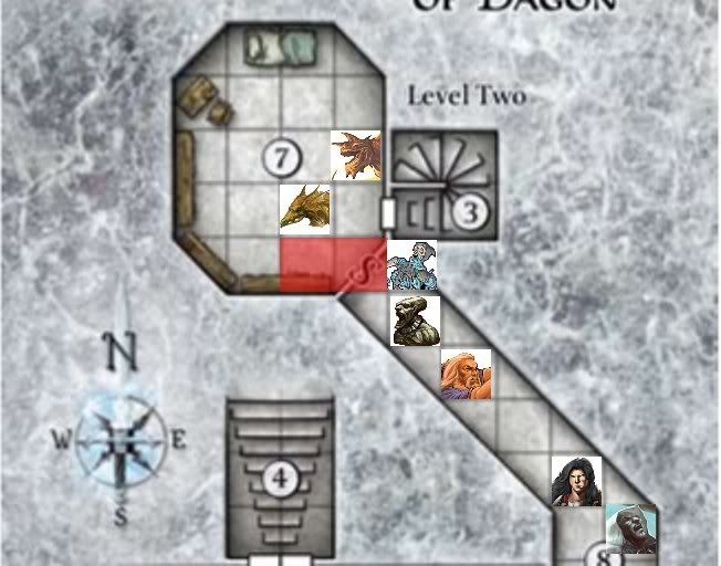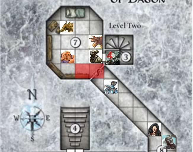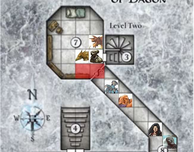 In case I'm offline when Rowan's next go comes up he going to use a healing word to let him spend a healing surge on himself (now down to 5 healing surges left, this gains him +16+3 (Wis mod)+1 (result of 1d6 roll) or 20hp putting him on 53hp unless something hits him in the meantime, he'll then charge to next to Seram to hit the foe in front of Seram with a melee basic attack rolling a 7+12+1 for 20 versus his AC doing 1d10+5 damage or 6+5 for 11pts if that does hit
