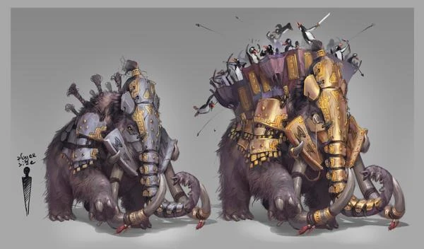 Armored mammoth (only add more scales, blotches, wings, and remove everyone but a big dragon riding atop it).
