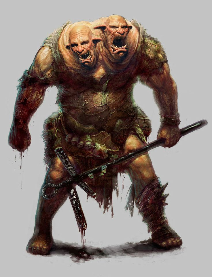 Before they can turn to help Zoli up the ledge, a massive, two headed figure steps up from behind the wall of the cave, a flail in each hand, and begins attacking! As it does so, it would seem the two heads are arguing with one another. It swings its weapons twice at Eugeni, and twice more at Morythine, each one managing to connect with a powerful blow against the heroes.