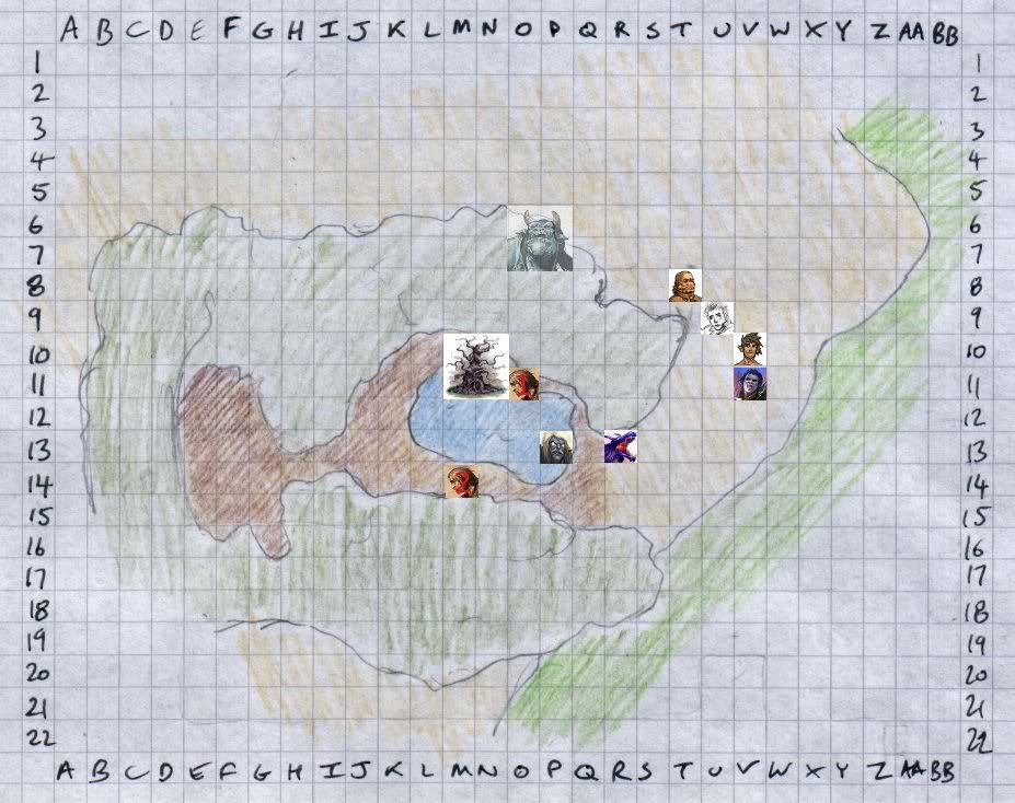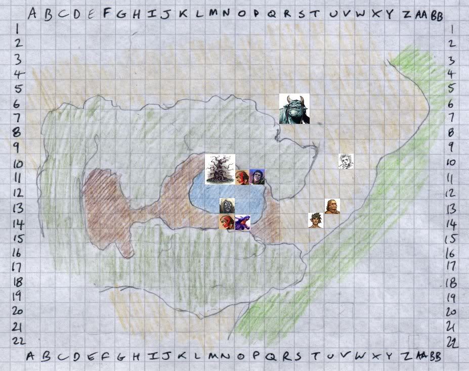 Sorry for not making this clear. The blue area is a pond. It is not only difficult terrain to wade through but moving through each square requires a DC15 Acrobatics or Athletics check to stay upright. A failed check means you fall prone. In fact, to reiterate (I have lost track to whom this has been made clear) the dark brown, green and blue squares are difficult terrain; the green squares also provide cover and concealment. Would you like to reconsider?