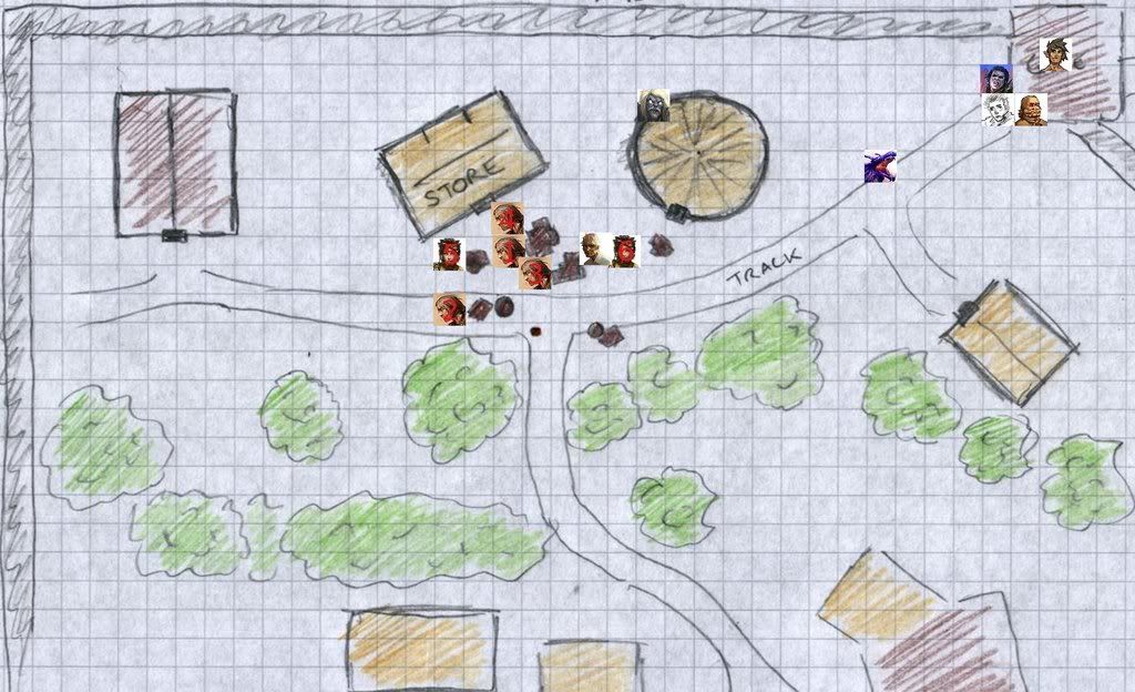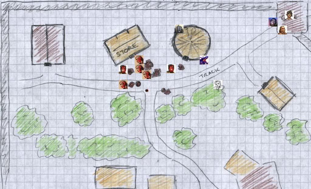 Move 9 squares (Double). Hunter's Quarry on one 4 squares diagonal from new position (he is beside store). Stealth (include -5 for move)Stealth (1d20+3=22) Wow! I should have played a Rogue!