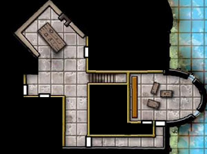 This room looks to have once been some sort of arcane workshop, although little remains but broken glassware, shattered jars of pottery, that contain dust and mold, and several rusty instruments and tools. A row of soggy books sits on the northern end of a workbench along the western wall. At the other end of the workbench, what looks like three iron birdcages sit, each containing a dead diseased rat. To the east, two stained-glass windows loom. The northern window depicts a thin man with gaunt features drinking a foul-looking brew of green fluid, while the southern one shows the same man but in an advanced state of decay, as if he had been dead for several weeks. His arms raised and head thrown back in triumph, his rotting body turns to smoke and spirals into a seven-sided box.