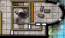Piles of broken stone, dirt, and a few ruined pickaxes line the edges of this room. The floor in the middle of the room has been torn up to reveal an ancient set of stone spiral stairs, obviously of much older construction than the surrounding basement, winding deep into the bedrock below. A foul stink, like that of rotten meat, wafts up on a cold breeze from the darkness.