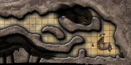 The stairs end in a limestone cavern. The walls drip with moisture, and swaths of black and dark blue mold grow in spiraling, tangled patterns on the floor, and a rhythmic sound - as of the breathing of some immense creature - echoes through the cave through three tunnels, one to the north and two to the west. Of the two western tunnels, the southernmost one seems to be a relatively new creation.