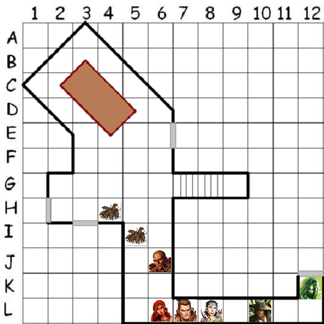 Lym moves to L5 and casts Fireball at the borderline of E5/F5, so as to get the rats without setting Lucian of fire as well. Reflex DC17 for half of 5d6 + 2 ⇒ (4, 4, 6, 6, 3) + 2 = 25 fire damage.