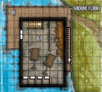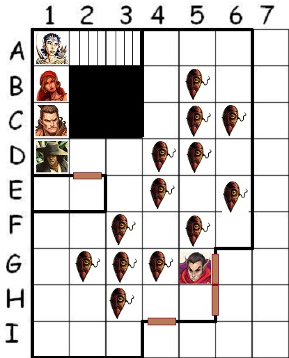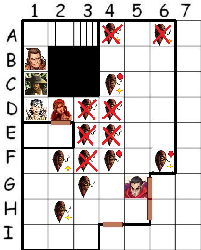 Lym moves forward and points up at the edge of the opposite wall where it meets the ceiling, then lets loose a bead of flame that flies to its target, which explodes on impact. Sawdust incinerates in a flash, and the areas of the walls, floor, and ceiling caught in the explosion are heavily scorched. Three of the foes in the southeast corner avoided damage altogether, but everyone else, including the elf, were burned. Many of the cultists now lie dead.