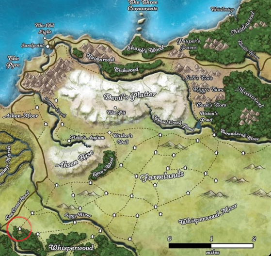 Hambley's farm is nestled on the western edge of the Whisperwood (bottom left of Map). Getting there means traveling south along the Lost Coast Road for nearly four miles.
