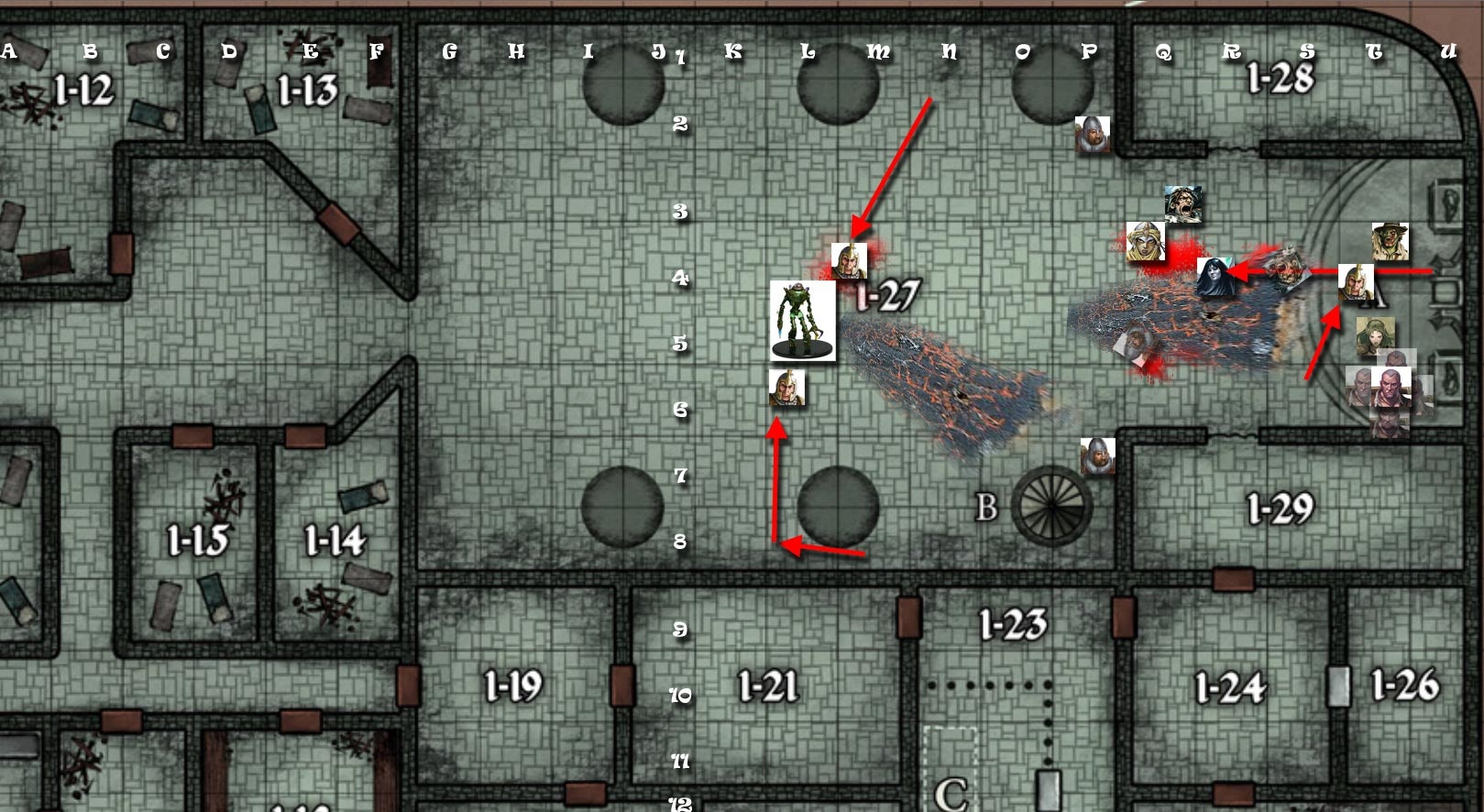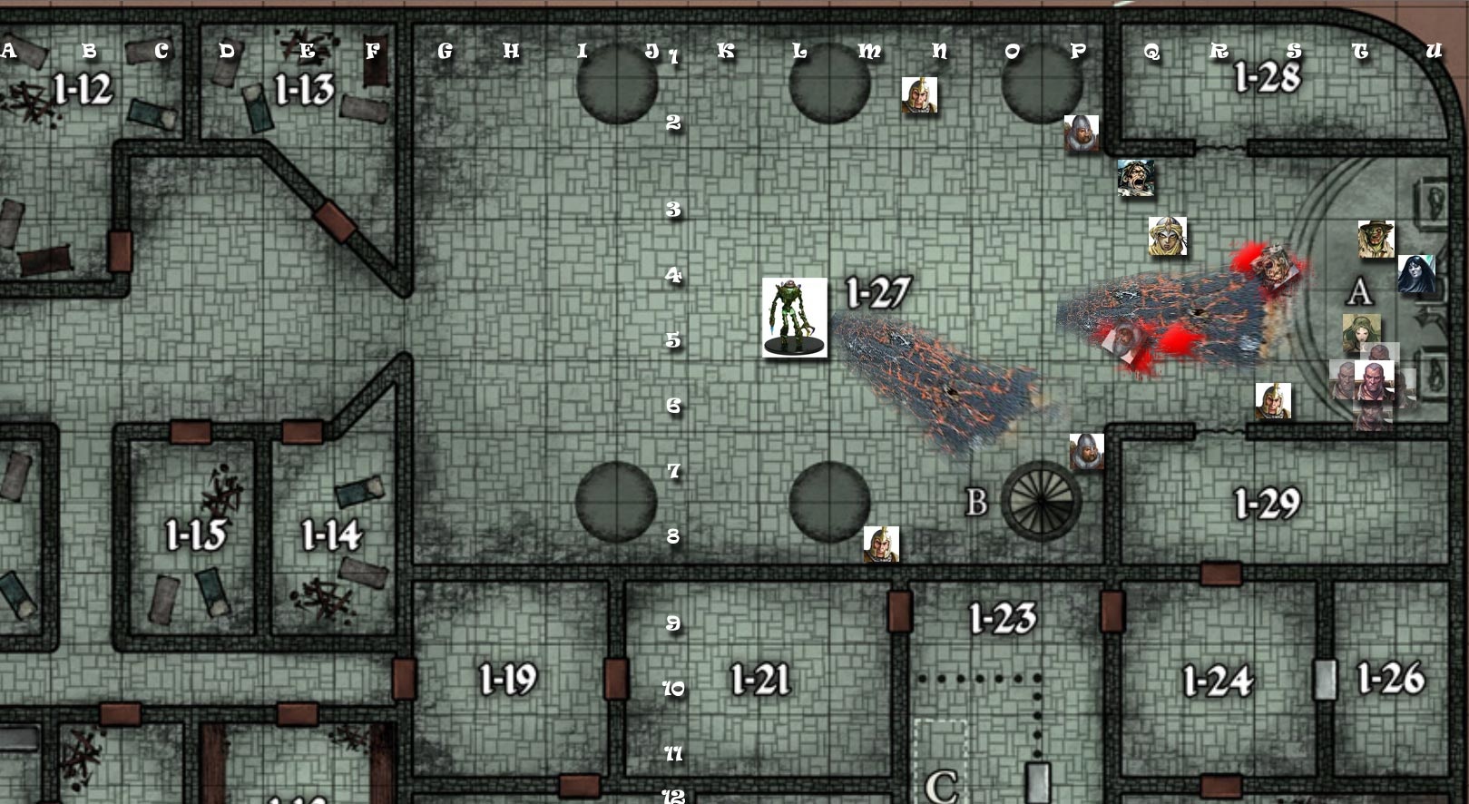 The fighters at M and N nod at eachother and charge in - they are obviously applying some well rehearsed tactic on the construct. However, it seems they underestimated the length of Artephius' arms, teaching N2 a valuable: 2d8 + 8 + 1d6 ⇒ (7, 1) + 8 + (5) = 21 lesson, as he casually grabs the fighter by the neck and injects some acid from his reservoir into his throat.