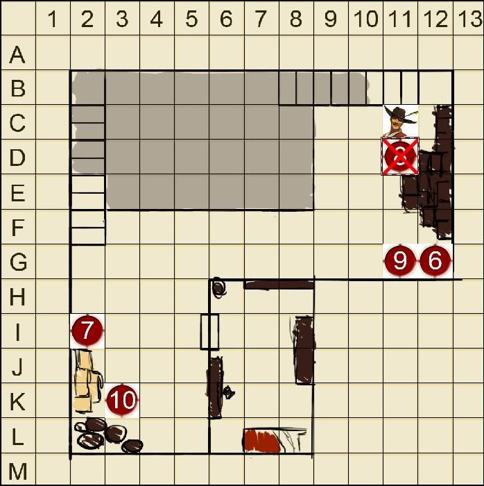 As Durnak puts another thug into a deeper sleep, Genisen sneaks up the rest of the stairs and finds five more thugs. The smell of ale and rum is strong and it looks like they may have fallen asleep a few hours before you arrived at most. Dolgana makes her way to the thug on a wall well away from the others, she bumbles a bit, but the man is so far under, Durnak needn't have worried. Fearghus, though, creeps up on the two under the other set of stairs with nary a whisper.