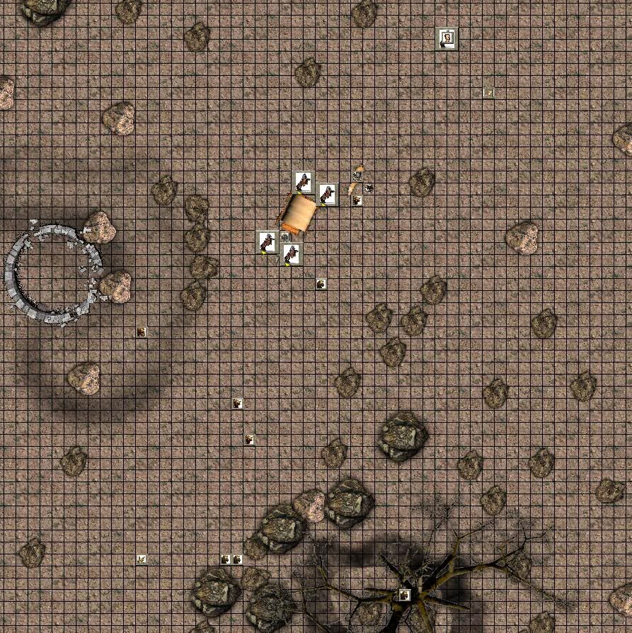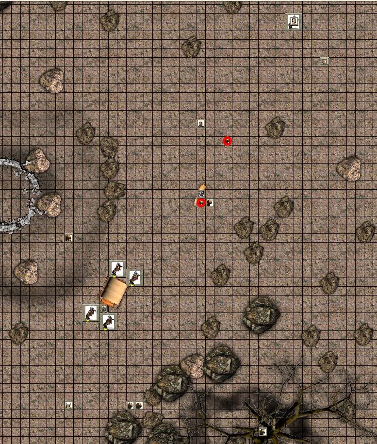 Two other gnolls move out from behind a boulder, firing one arrow each. One arrow strikes each of the horses pulling the wagon.