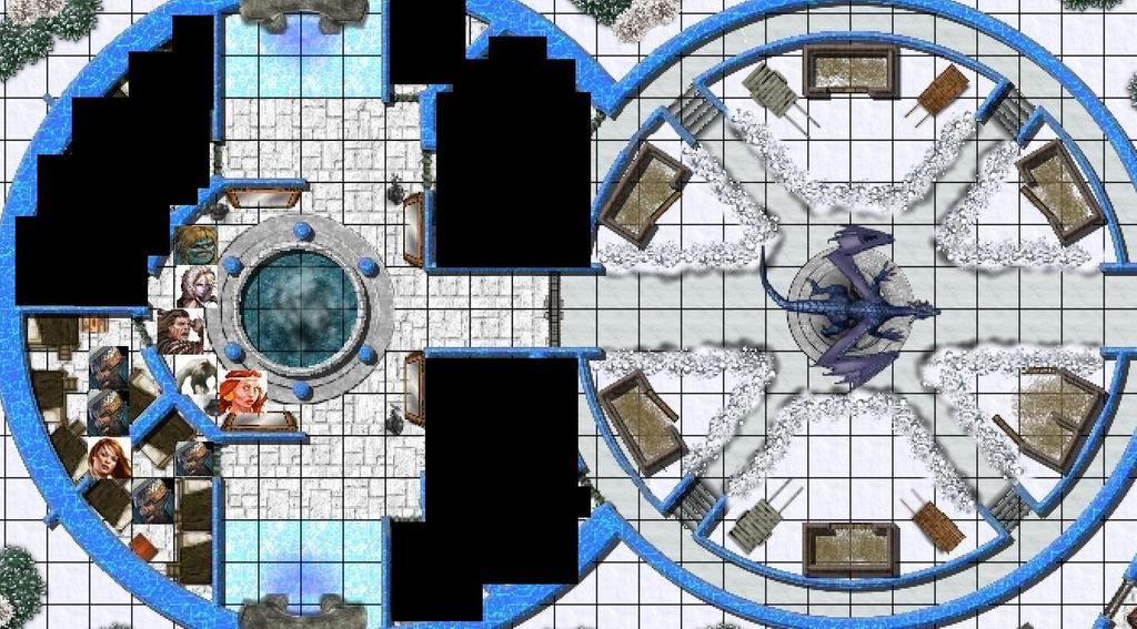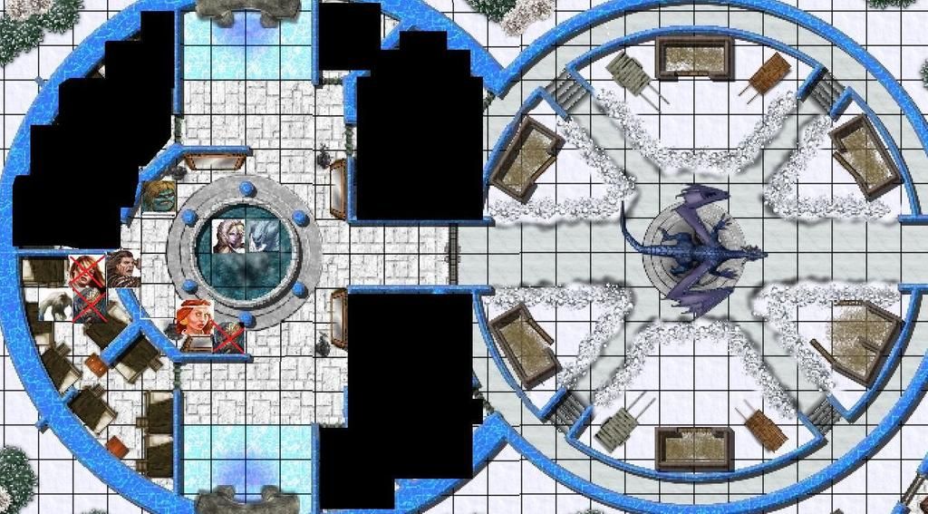One of the other guards opens the southern door to the room, and a moment later he and the third man comes wheeling about behind Asgrid. One swipes at the dwarf with his own blade, but it bounces helplessly off of the oracle's conjured ice armor. He looks on in shock. The other isn't able to get close enough for a strike. One guard uses a move action to open the door and move out through it, the other moves out and around to attack Asgrid.