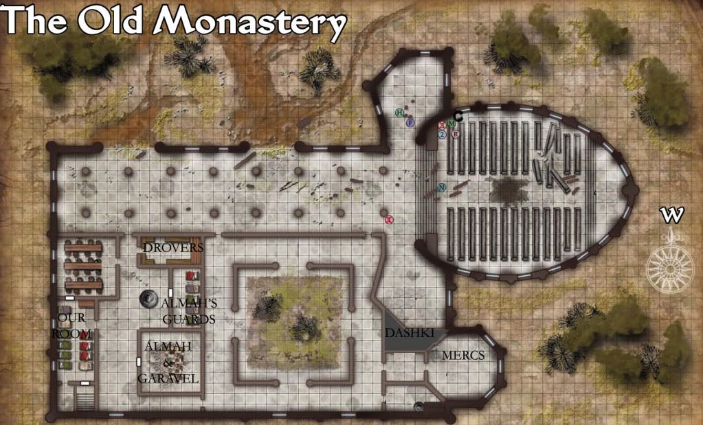 Makin walks with Lady Almah to the monastery entrance, ahead of the arriving caravan, her personal guards and Garavel are nearby while the mercenaries help and guard the camels and supplies as the drovers settle them after the short journey.