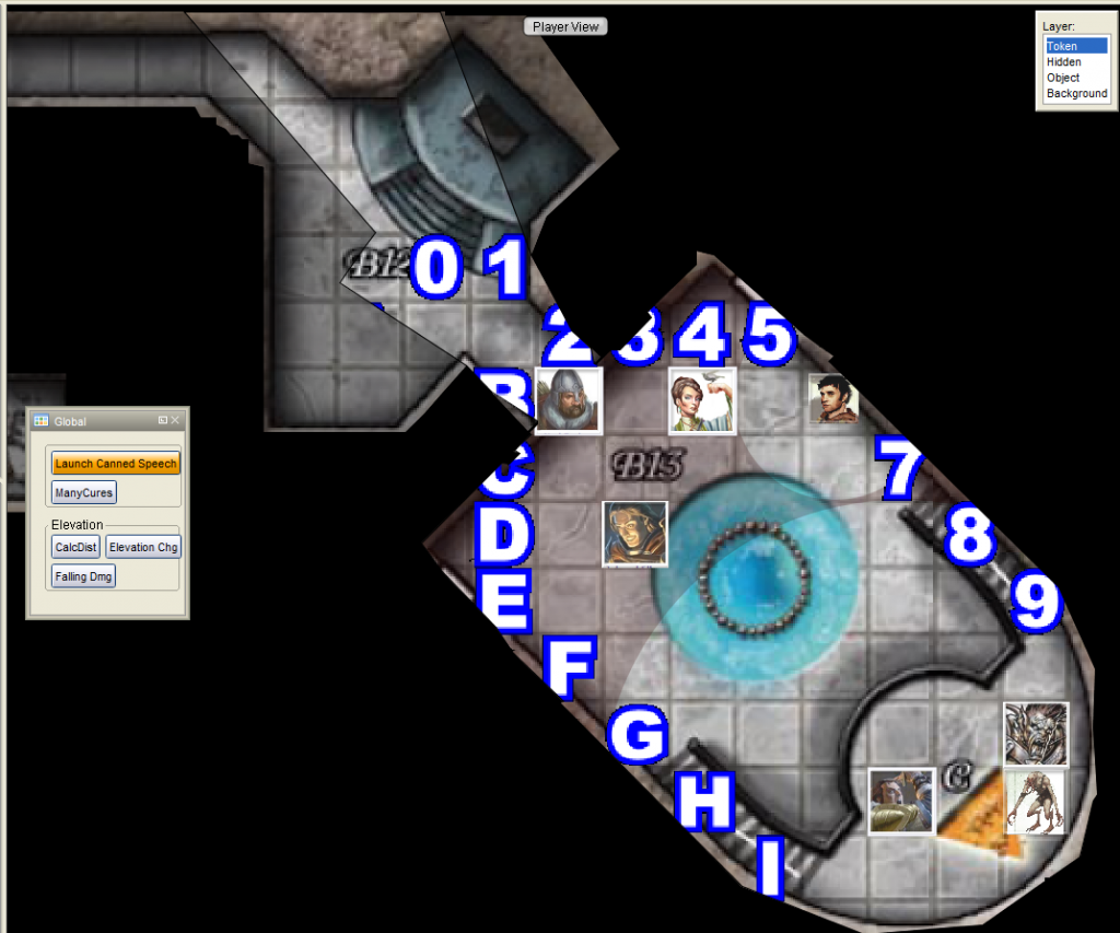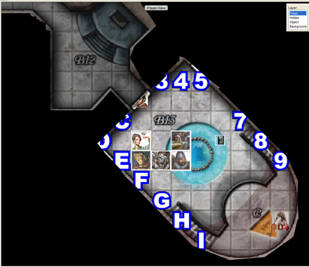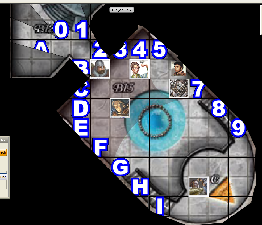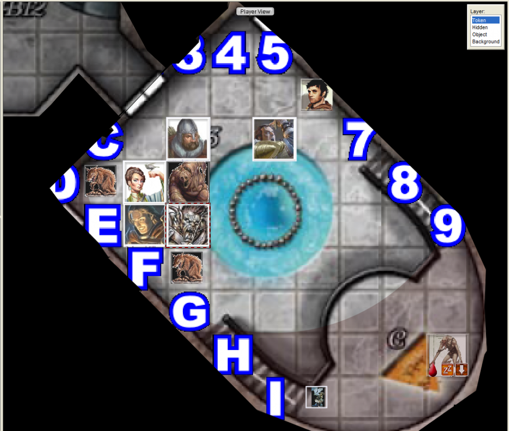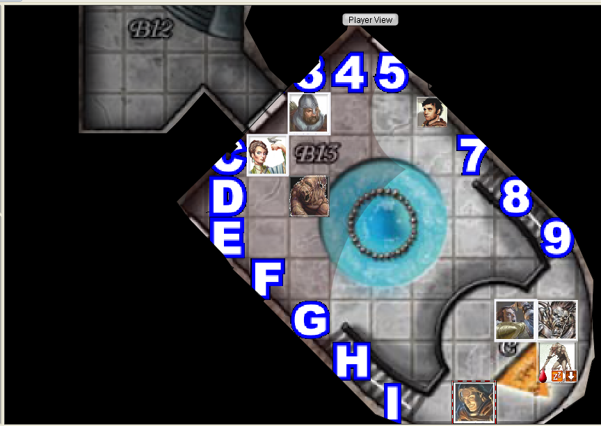 (NOTE: if you wish to keep targeting this poor creature, you’ll have to do try to discern with a Perception check the creature’s location and then target a specific square. If your PER check fails, you can still attack, but you'd need to tell me which square. At the risk of cluttering the map, I’ve added some row & column headers.).