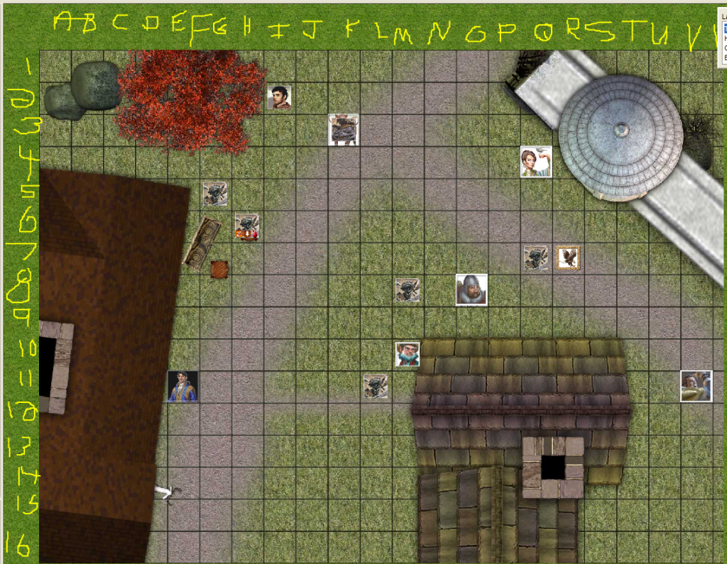 (Note – since N9 would put Ned in the same space as Mervyn, and N8 would trigger an attack of opportunity from the goblin, if Ned did a ranged attack here, I’m assuming Ned would stop short and just move to O8. I’m also assuming Ned would run through Q9 instead of Q8.) Ned rushes closer to Mervyn, firing an arrow, which sails over the goblin’s head. "Over here you vermin! Time to die!"