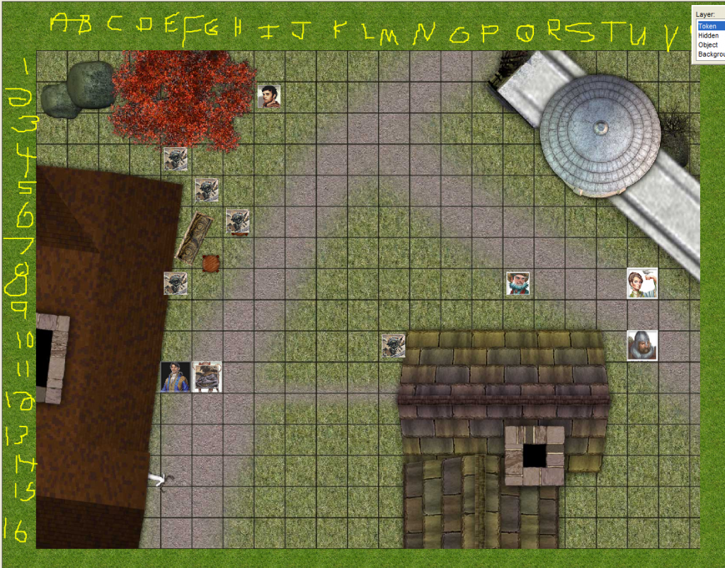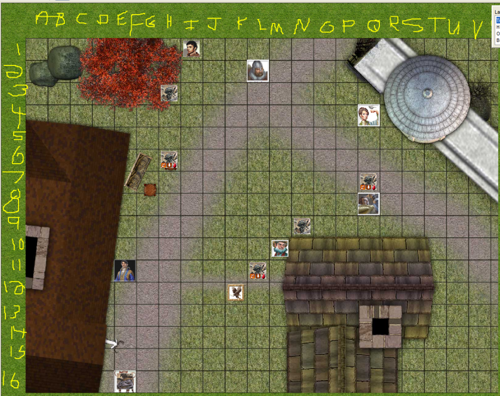 NOTE: The goblin token at G11 looks a little odd. It’s the goblin commando riding atop his goblin dog. The newest member of our party, Lleidr, is at I2. The weird looking structure along the north-east corner of the map is the town gate.