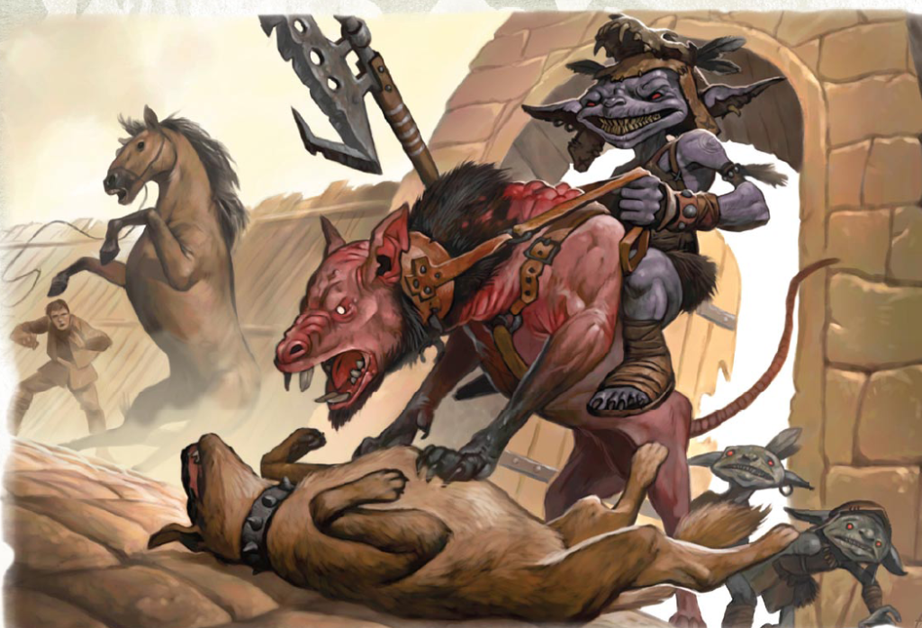 Mervyn stops short after rounding the corner. At the end of the road, the three of you (Mervyn, Selia and Ned) spy another old friend from earlier years, Lleidr, who grew up in Wartle and travelled often to Sandpoint when his father had to ‘trek into town’. Lleidr is hiding from a trio of goblins, who were, until just now, hiding from a barking dog.
