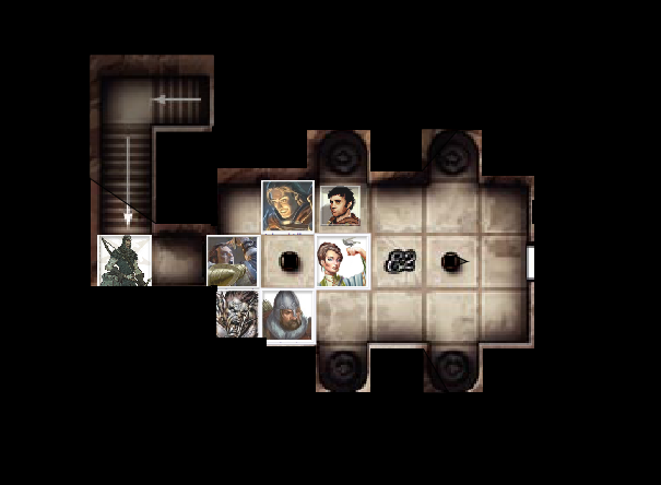 The stair winds down into the depths at a steep pitch. A stone door just around the corner from the steps hangs slightly ajar, the detailed carvings that once covered its surface defaced by chisel marks and hammer blows to the extent that only a few remnants of images (mostly of gemstones and crowns) remain. The floor here is slanted downward toward the west.