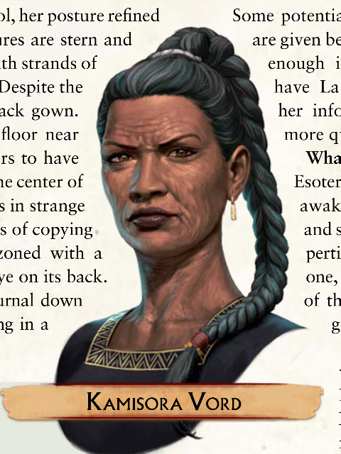 An expensive lantern rests on the floor near her, illuminating a door that appears to have once been barred. A metal plate in the center of the door is covered with etched lines in strange patterns. Lady Vord is in the process of copying those runes into a journal emblazoned with a golden scarab beetle with a single eye on its back. As the group arrive, she sets the journal down and rises to meet her guests, speaking in a heavy Ustalavic accent.