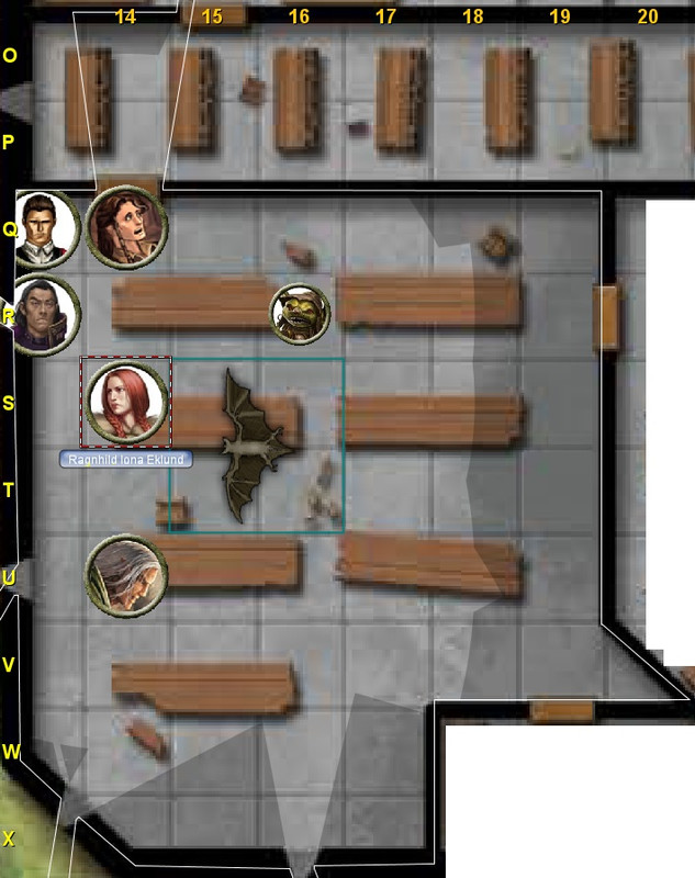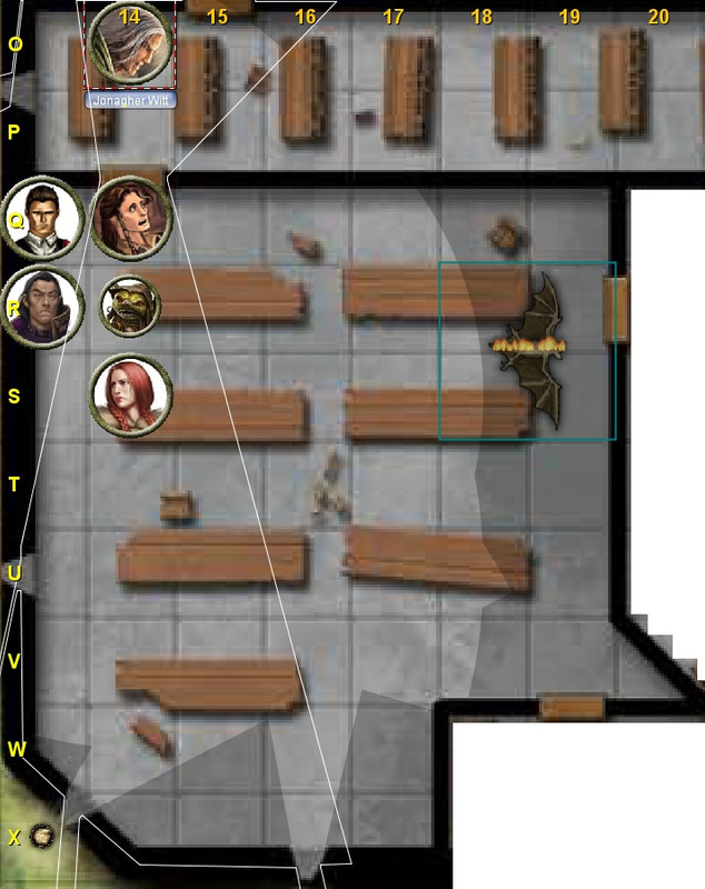 Jonagher slips between the gathered throng inside the door, the last one to join the fray. He moves to the other side of Ragna (to T13) and then fires an arrow at the bat.
