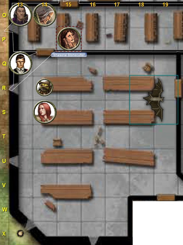 Shaserai hears the commotion as Highness rushes into the next room. He goes into what might have once been a scriptorium, and seeing the giant bat attacking the goblin and the others retaliating he joins the fray.