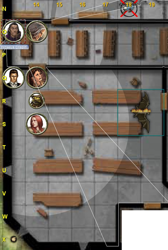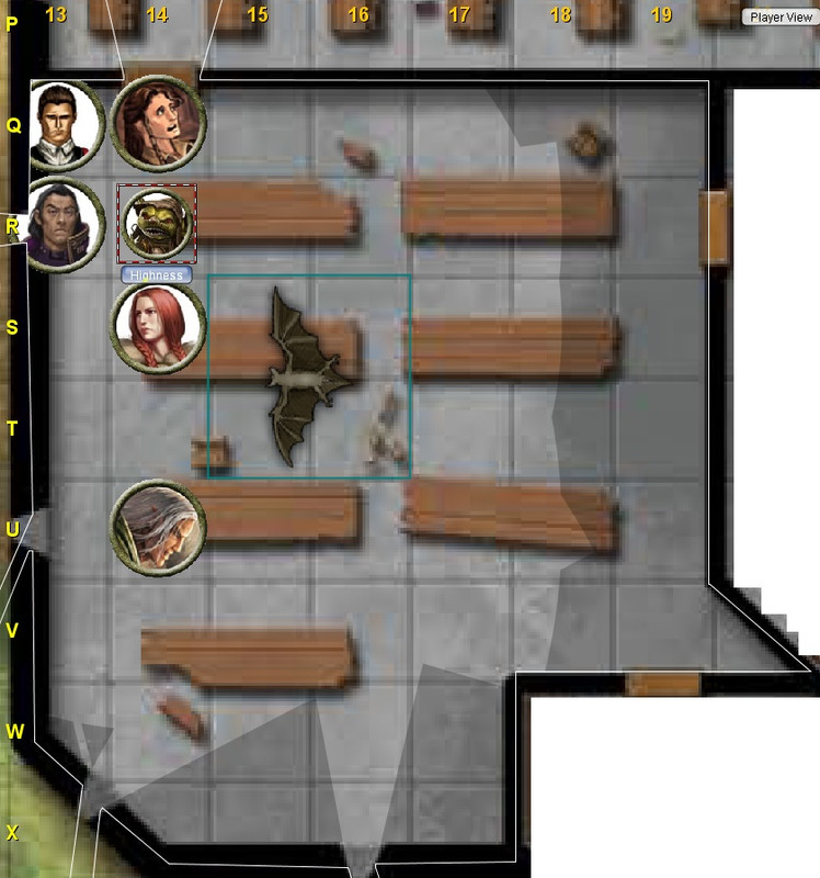 Seeing his arrow failed to hit home, and fearing it might draw the bat's fangs his way, Jonagher slips under the table (at U14) to hide and look for his next best opportunity to contribute to the fight...hopefully, taking the beast by surprise.