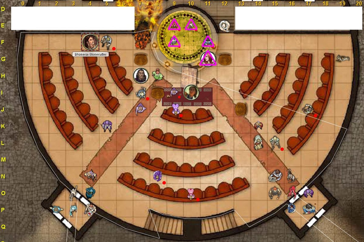 The pink triangle indicates someone who is on the elevated stage (right now, 5 children). The red dot indicates panicked spectators. Unable to save themselves, they will require PCs to expend actions to direct them. It will take two actions to a) get the attention of a panicking spectator within 50 feet and b) persuade them to evacuate.