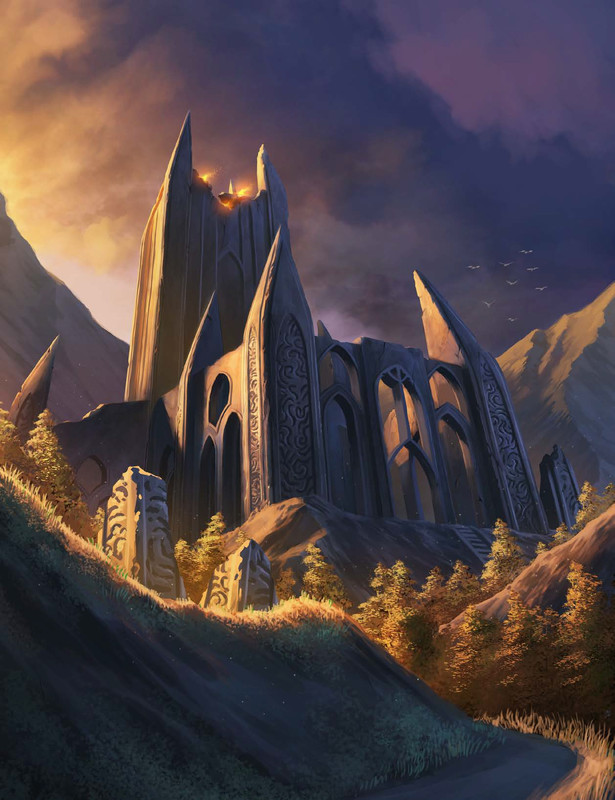 A small figure encumbered with a large backpack trudges up the gentle incline of the road toward the imposing edifice. The person turns briefly to look back at the group swiftly gaining ground on it, but its features remain obscured in the shadow cast by the hill the road winds past. A few moments later and the party has overtaken the figure, who turns and drops the backpack off onto the road. The backpack thumping to the ground raises a swirl of dust for a moment before it twirls away in the ever-present breeze off the mountains.