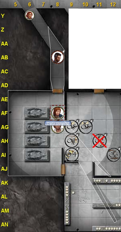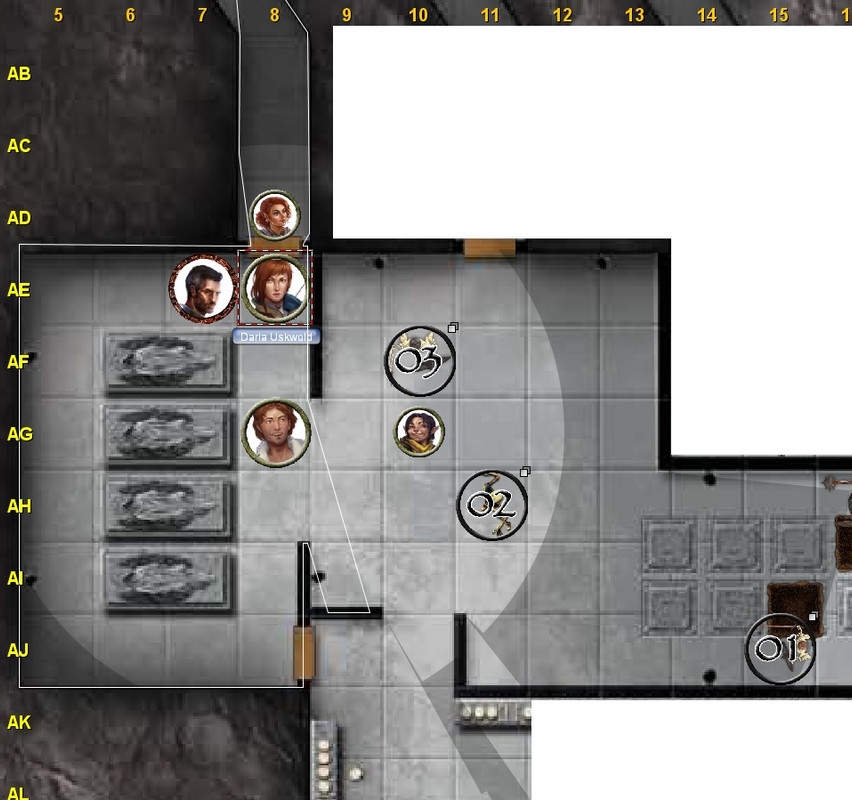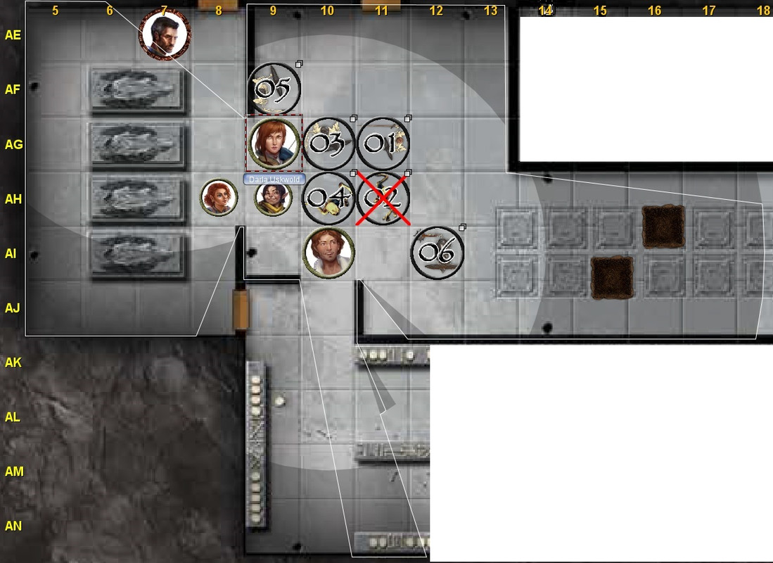 Aronida Interacts to pick up item *triggering AoO by Skeleton 1* 1d20 + 6 ⇒ (20) + 6 = 26: critical hit! damage 1d6 + 2 ⇒ (5) + 2 = 7 x 2 = 14, Strides to AC8 & Strides to Y6