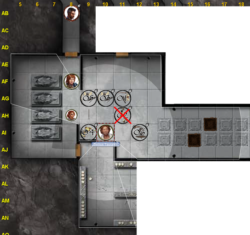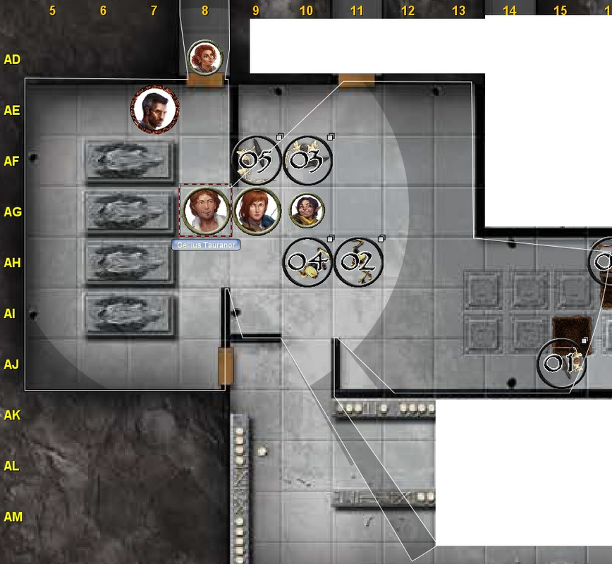 Gellius peers around the corner into a larger open space. The flagstones that pave the floor are carved with names and dates; it appears that the whole area is a cemetery with the floor doubling as headstones. In the shadows at the edge of his light, it appears that a few of the flagstones have been pried up. There is something standing at the very edge of the light....