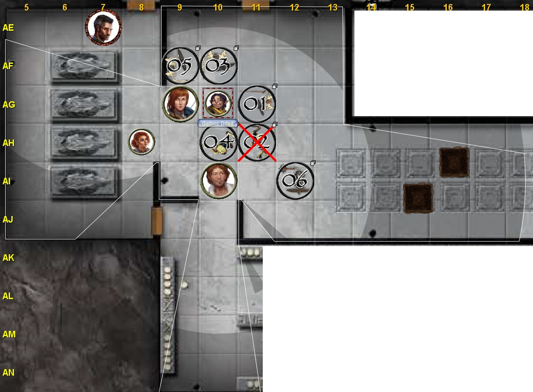 Alek Strides to AG8, Interacts to pick up Gethric *triggering AoO by Skeleton 5* 1d20 + 6 ⇒ (18) + 6 = 24: hit damage 1d6 + 2 ⇒ (3) + 2 = 5 & Strides to AB8