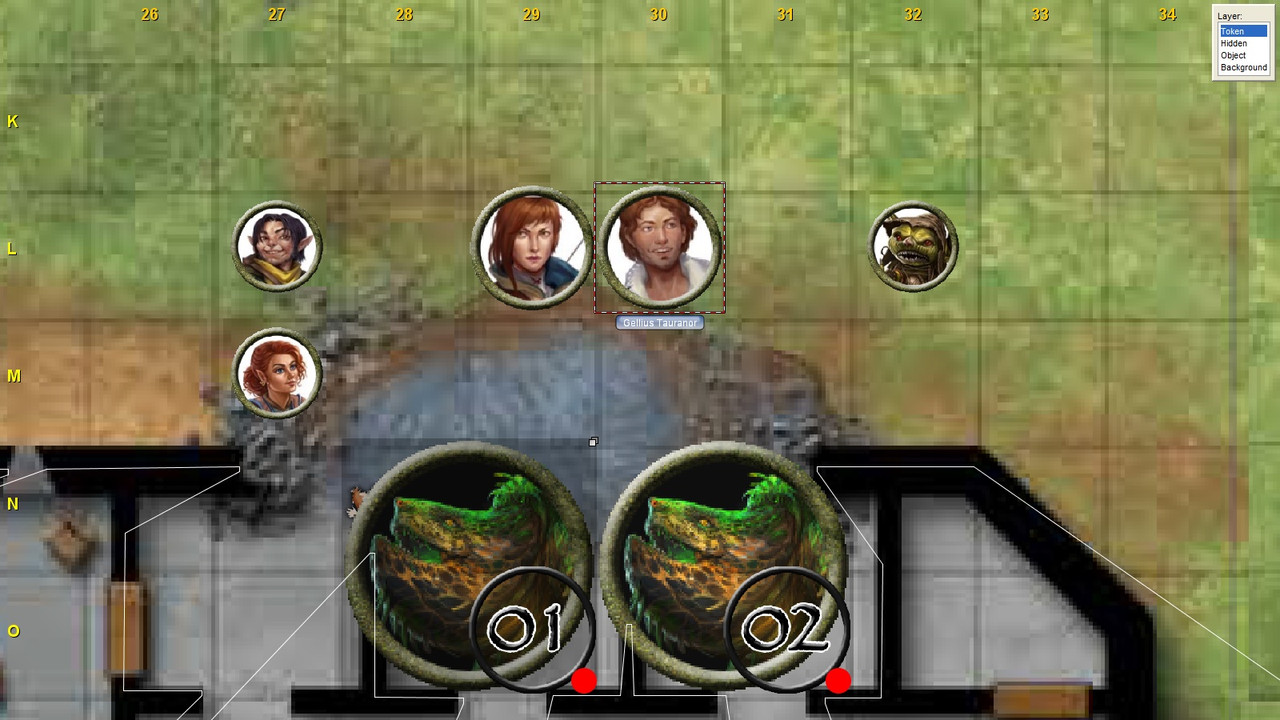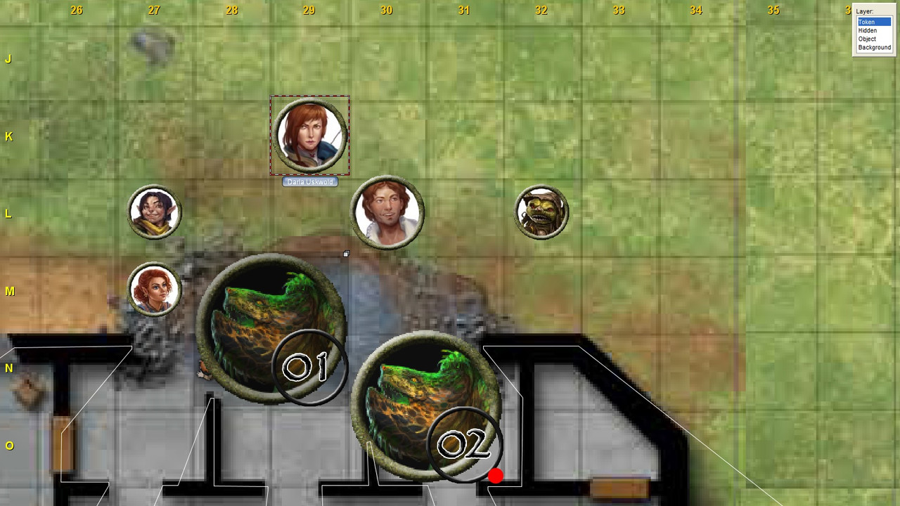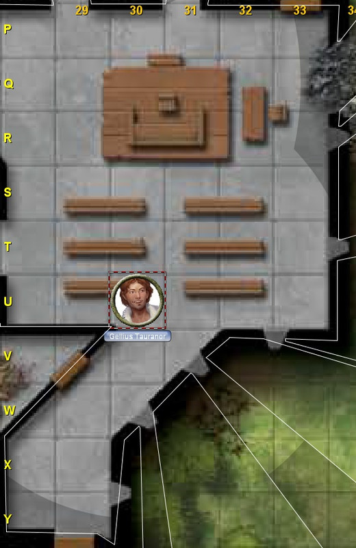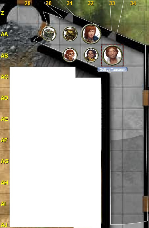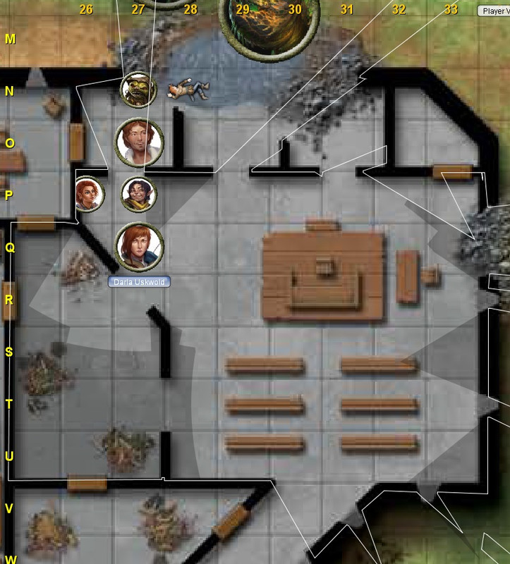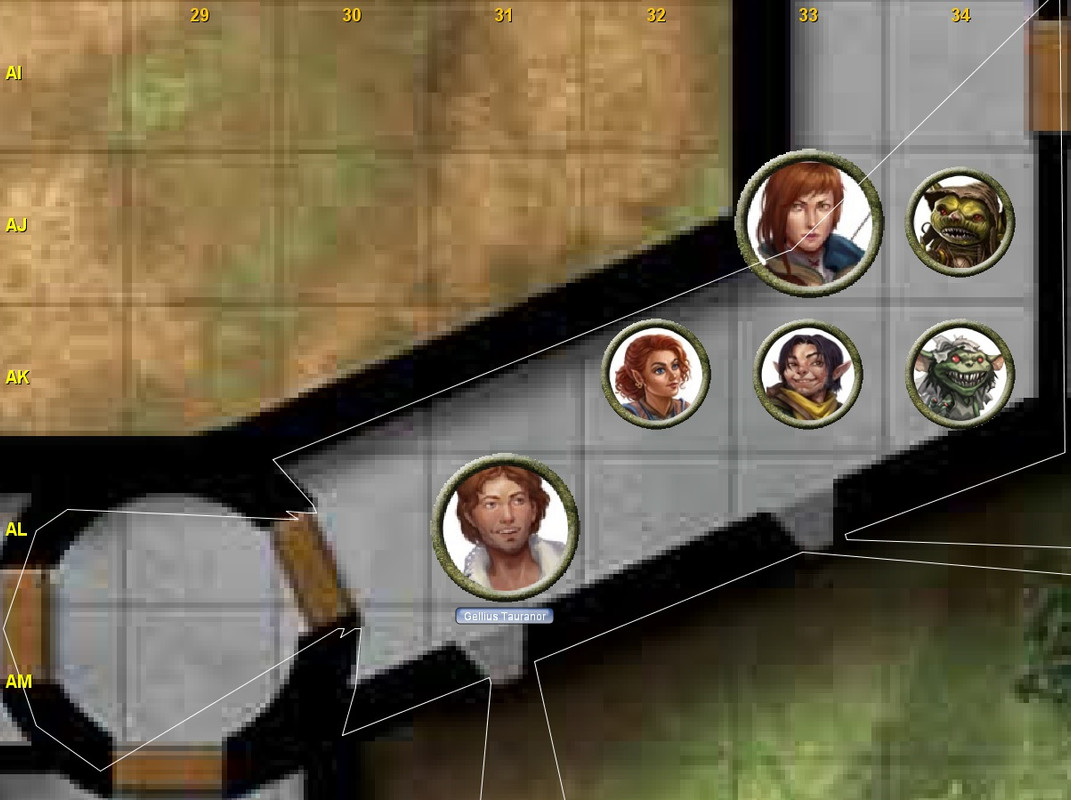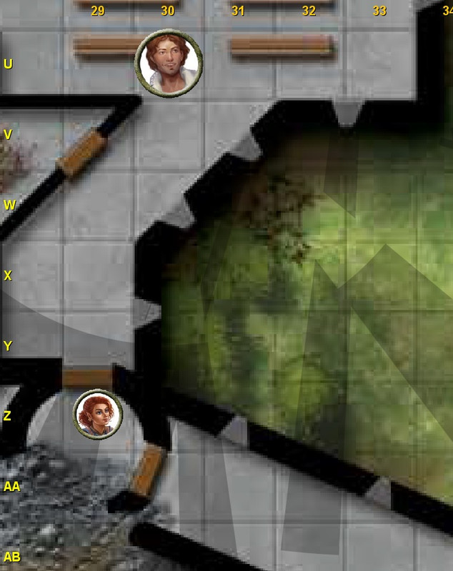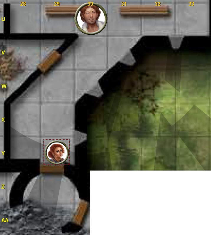 I’ll move to U30 and keep an eye down the diagonal corridor. If I can make any kind of recall knowledge check to guide us towards the courtyard and our goal, I’ll try that.