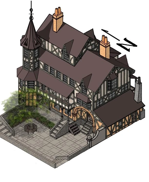 Trollskull Alley was a short street bounded on all sides by buildings, almost a long, skinny courtyard- and from the empty stalls there it looked like an occasional open air marketplace- with two entrances on the north and south side. Four stories tall and boasting balconies, a turret, and five chimneys, their new Manor looked like it had once been one of the grandest estates in the neighborhood.