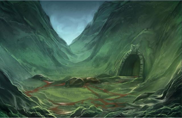 An archway of stone is set into the side of a small hill at the bottom of the valley. Moss has overgrown many of the details, but one is still quite clear. The keystone of the arch is carved with a flame symbol with a stylized rune in the middle. Beyond the archway is a darkened tunned that leads to a pair of massive wooden doors, one of which is slightly ajar.