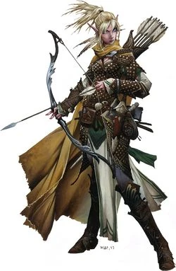 When Ro approaches Shalelu to seek motivational clarity, the elf stares at her unnervingly. But Ro is not one to be dissuaded. Shalelu returns to the work she had been doing before Ro's interruption, carrying on in short, stilted phrases while she whittles an arrow shaft and checks its straightness.