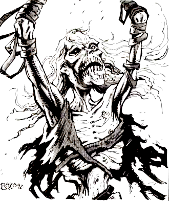 The corpse’s veins and arteries have been pulled out through jagged gashes in its wrists and shoulders and now dangle like leathery marionette’s string. A childlike giggle issues forth in the darkness above and the veins float upward. The bailiff corpse begins to jerk about like a puppet at the whim of some malevolent force. The thing’s gaunt face is eyeless, and its two gaping sockets fixed on nothingness as it snarls and lurches forward and attacks.