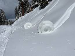 About an hour later, you come to a clearing in the forest, exposing a tall, steep, exposed slope. There are odd-looking wheels of rolled snow 4 to 6 inches wide and a foot to 18 inches tall at the bottom of the slope. From the snow wheels are straight lines that go up the slope. Looks like this.